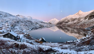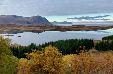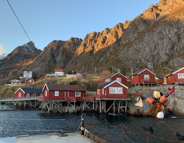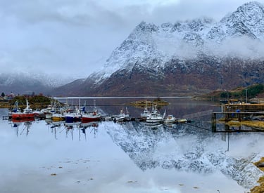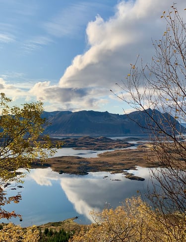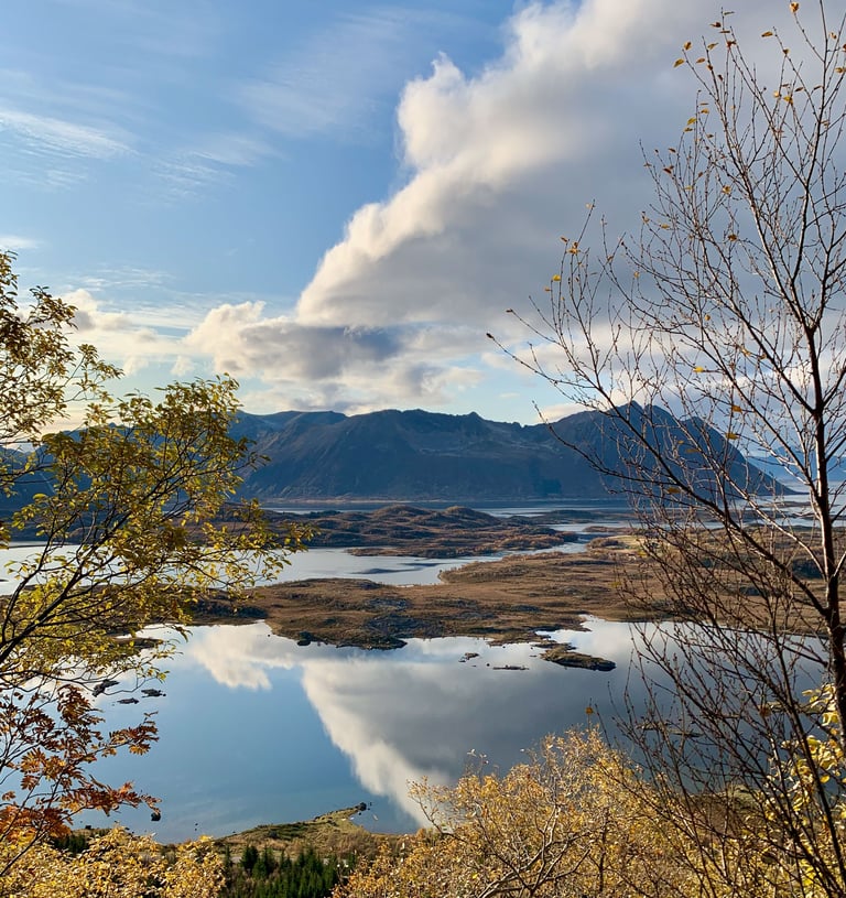 Hoog boven de poolcirkel, in de Noorse Zee, ligt de eilandengroep Lofoten. Hier wisselen steile bergen, smalle fjorden, witte stranden en kleurrijke vissersdorpjes elkaar af. In het najaar kleurt het landschap extra mooi dankzij de herfstkleuren en het prachtige, zachte licht. Bij zeldzame windstiltes spiegelen wolken en landschap in het overal aanwezige water. Het kan ook ineens sneeuwen. De bergtoppen krijgen dan een fotogeniek laagje poedersneeuw.